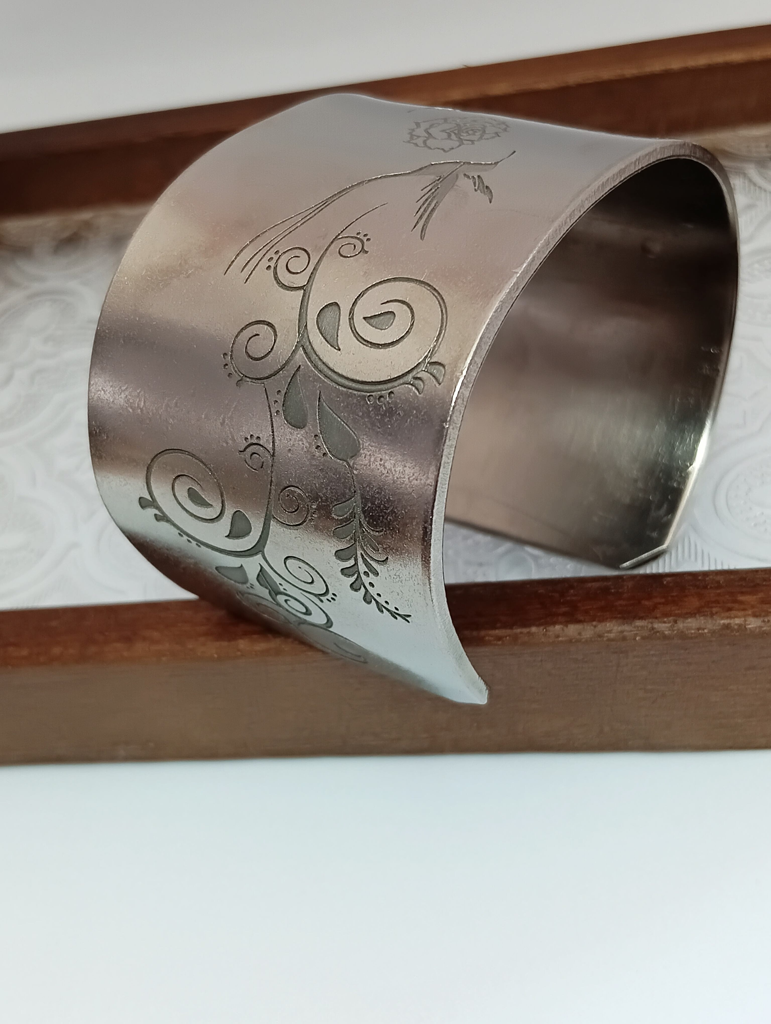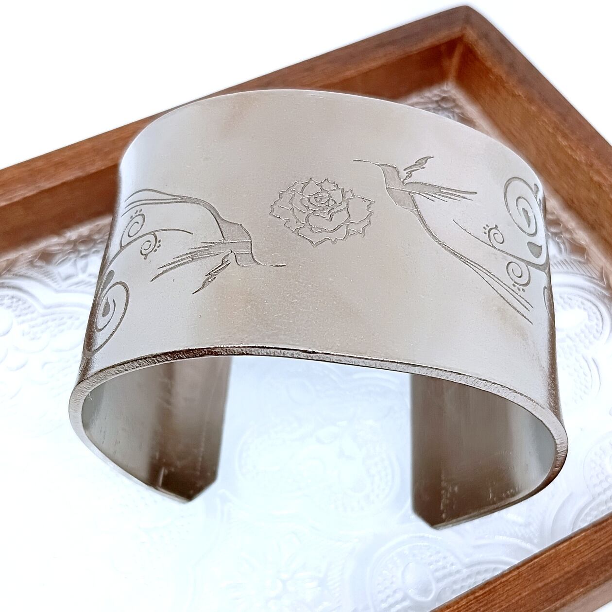 純チタンの板にヒヨドリの彫りを施した幅広バングル。